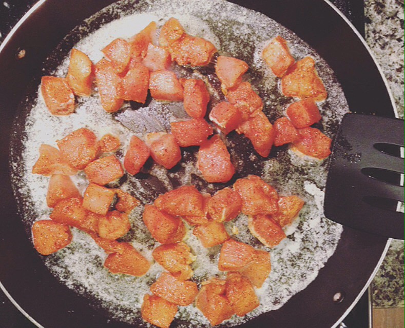 - While you are waiting for the pot to boil, cut up chicken into 2 inch squares. Season generously with Cajun Seasoning. (This is where the spice level is up to you! Chappy and I love to completely coat each piece and then usually add a few sprinkles to the sauce after as well. We always know we haven’t put enough if our noses are burning- HA.)