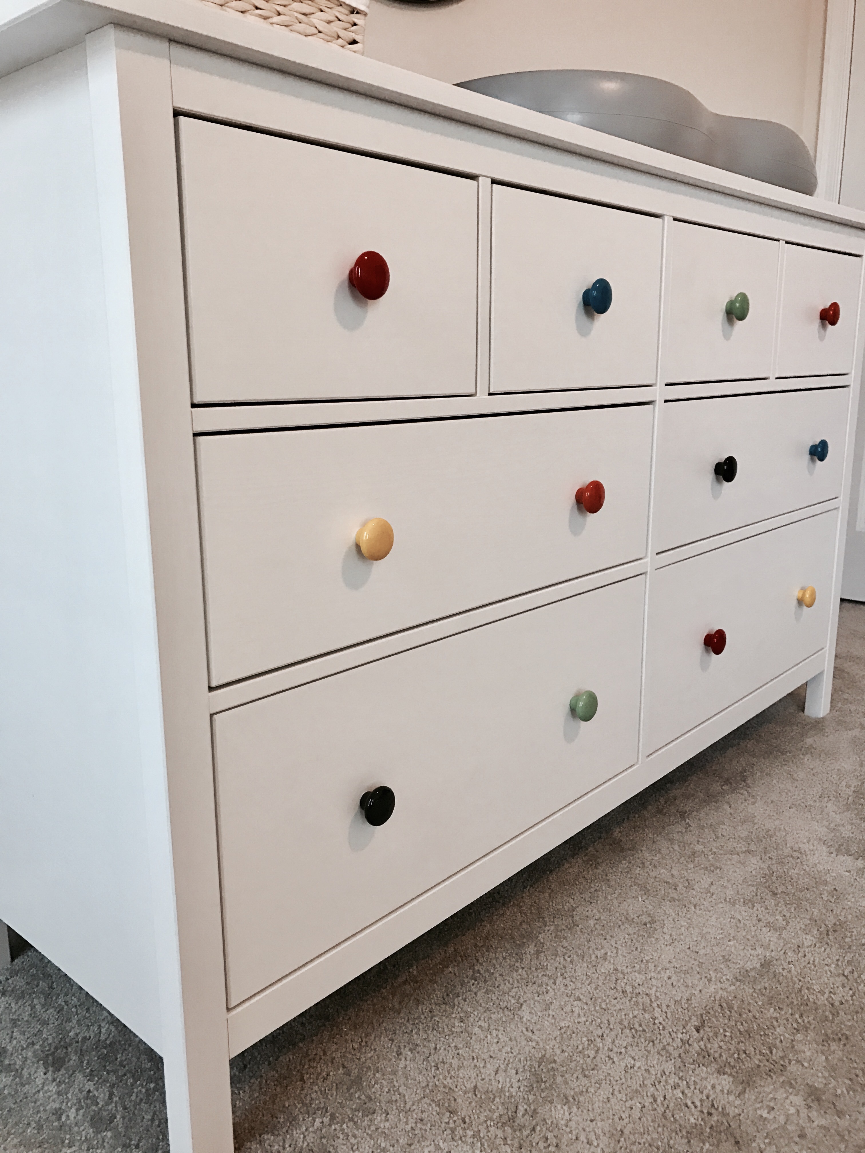 - Dresser Nobs: Chappy wanted to add a few more pops of color to the room so I found these nobs on Etsy and they were the perfect addition. I went with the larger size because I felt like it would look more like a kids room then.