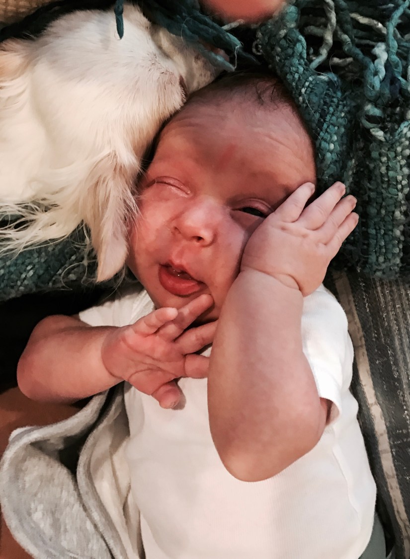 Some of Waylen’s favorite things thus far are his Ergobaby Carrier, cuddling with Ramone, skin to skin with mom, and when dad mimics the Arby’s “we have the meats” commercial. (Yes, I’m serious about that last one ha.) He had a little bit of baby ache at around 2 weeks old but it cleared quickly, he lifts his head from side to side while on tummy time, he makes eye contact, smiles, and loves to get his hair washed.