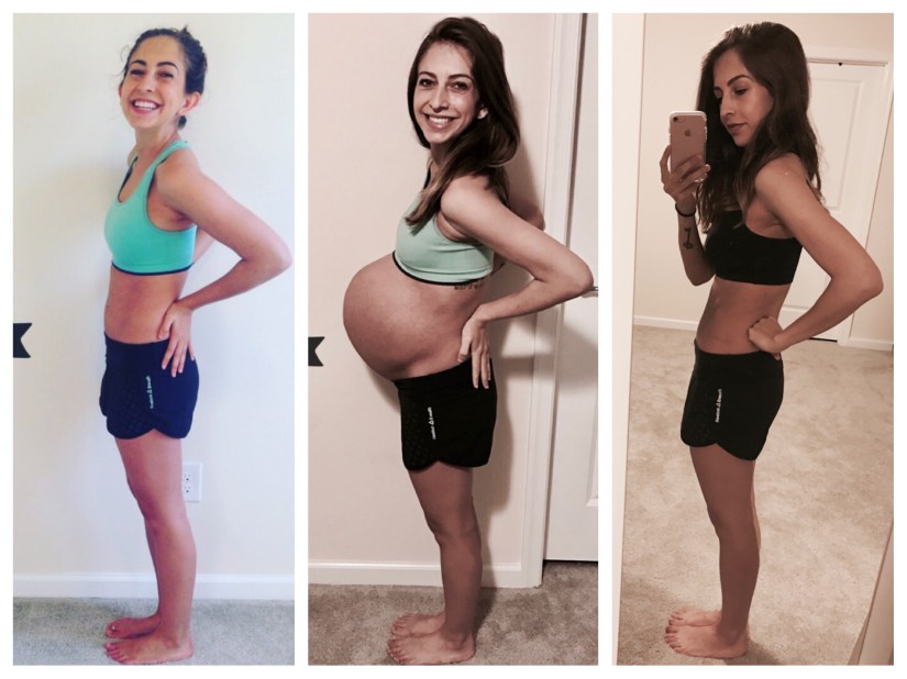 And here is a comparison of 8 weeks pregnant, 37 weeks pregnant, and 1 month postpartum:
