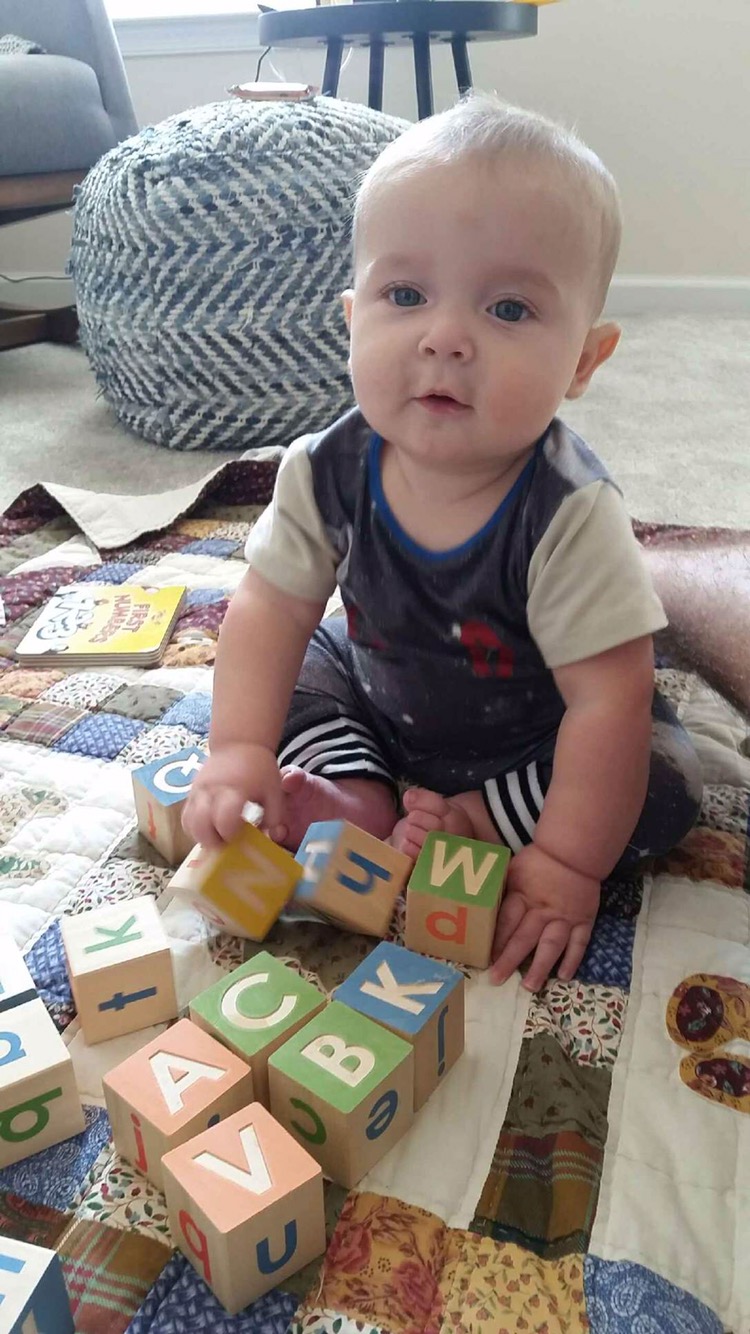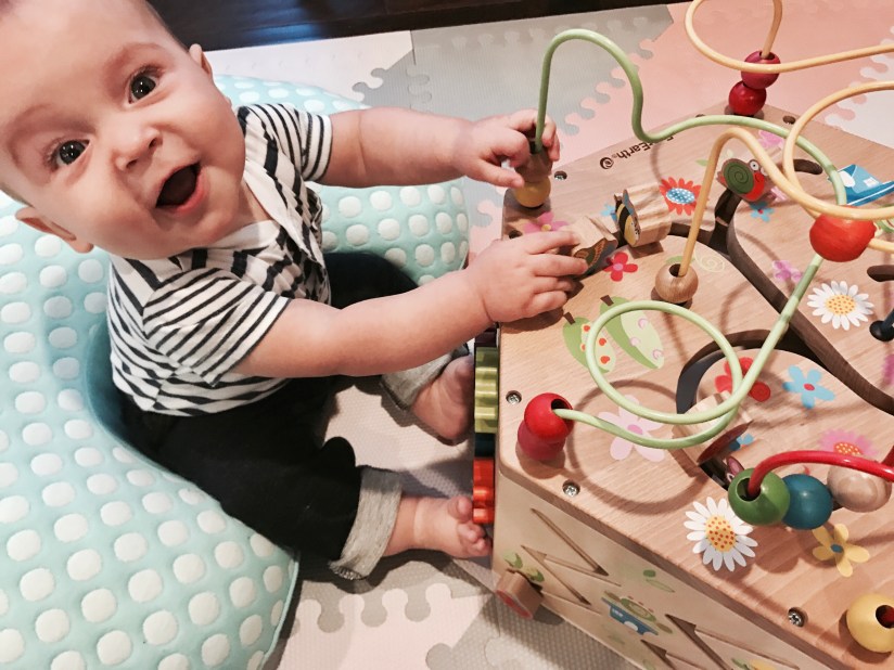 He is a champ at sitting on his own now, rolls from back to front and back like crazy, loves standing up, and blowing spit bubbles. He still is my little toothless baby though and hasn’t master how to crawl yet. Maybe one of those will happen this next month?! Who knows!