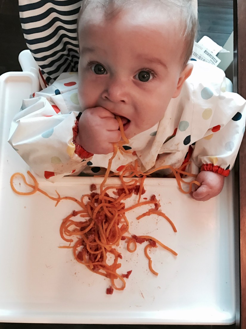 He’s great at holding himself up while standing, takes steps while holding our hands, and can sometimes pull himself up to standing. He still doesn’t crawl fully though! He will get into crawl position on his hands and knees but only actually moves in an army crawl. That really doesn’t slow him down though. He still books it across the floor on his elbows!
