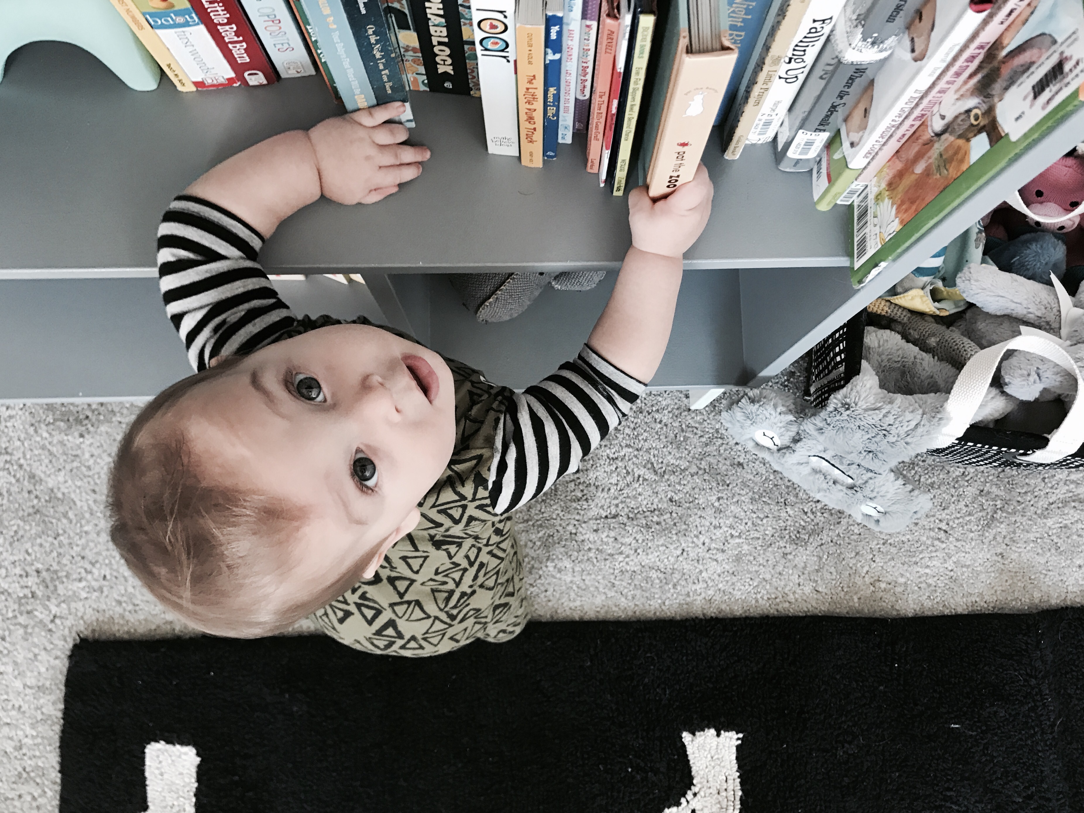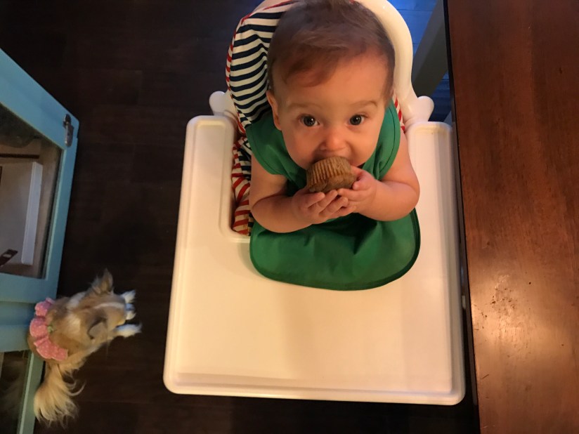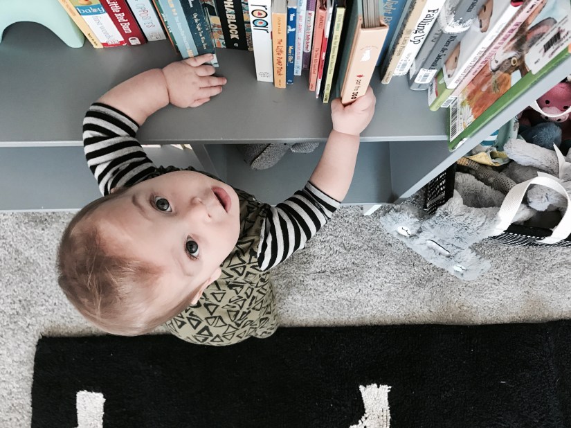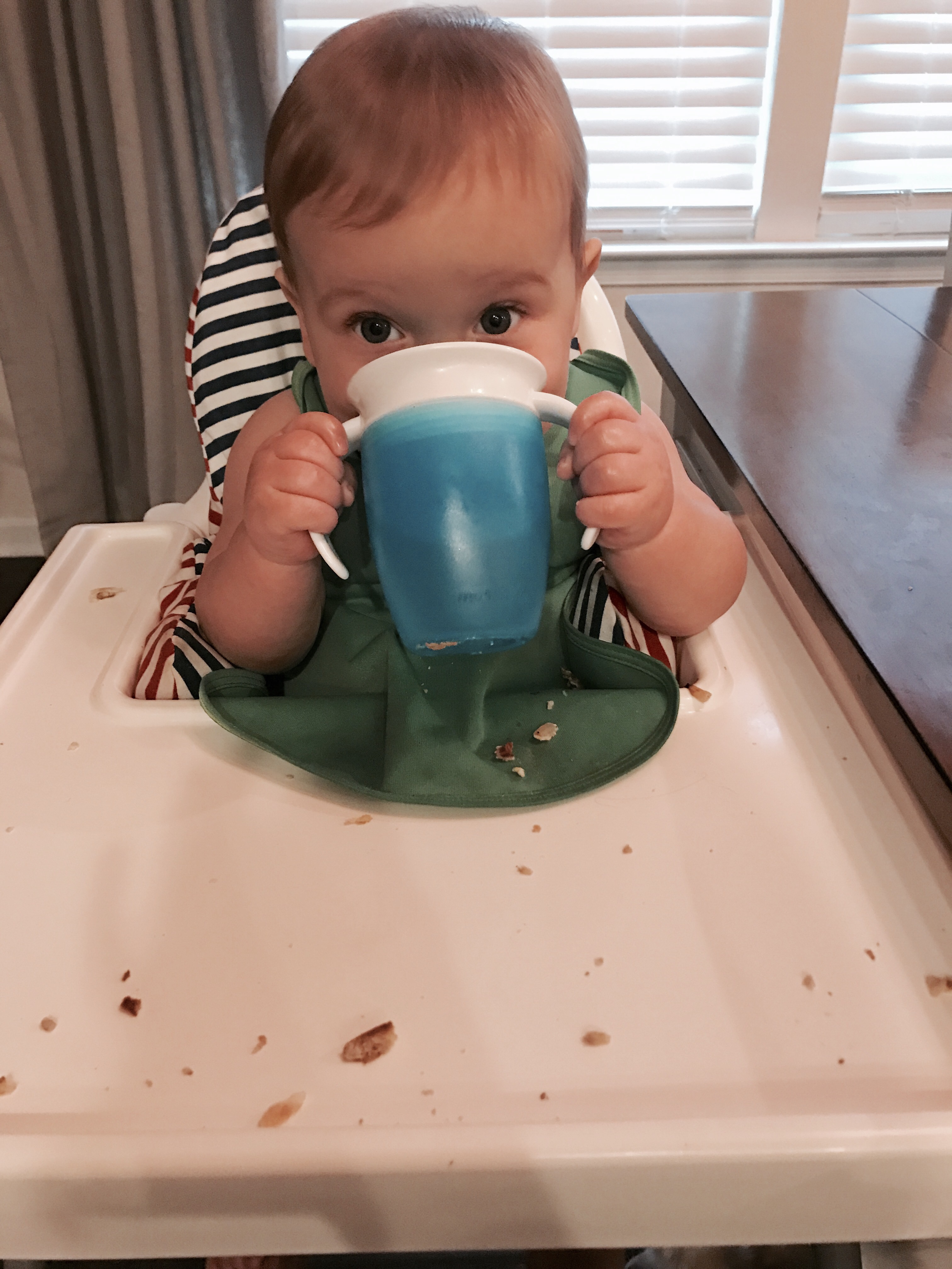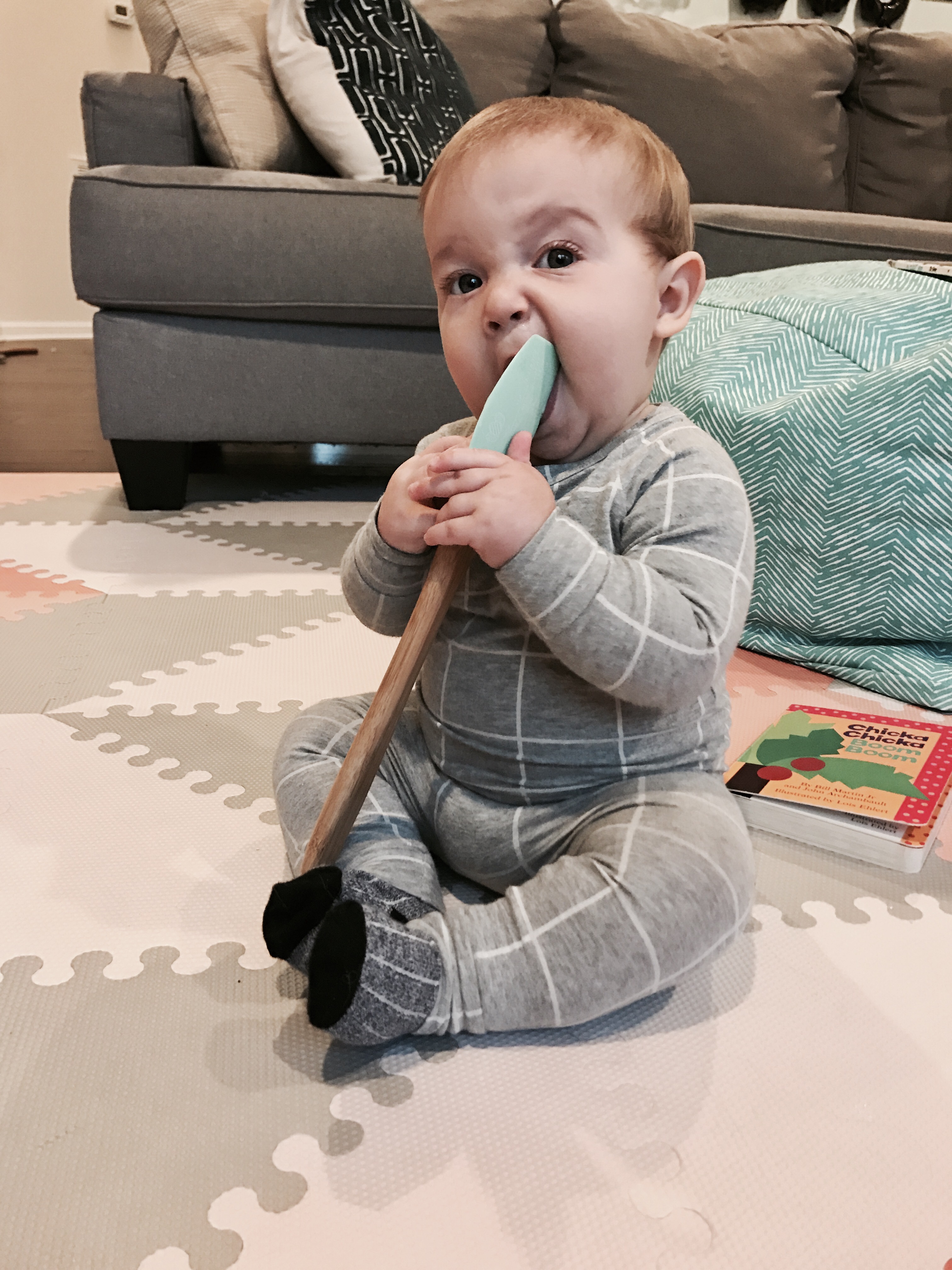 His favorite things this month are eating, drinking from his cup, moving his ball pit, playing fetch with Pickles, pulling all the books off the shelf, door stops, chewing on the media cabinets knobs, and getting into mischief.