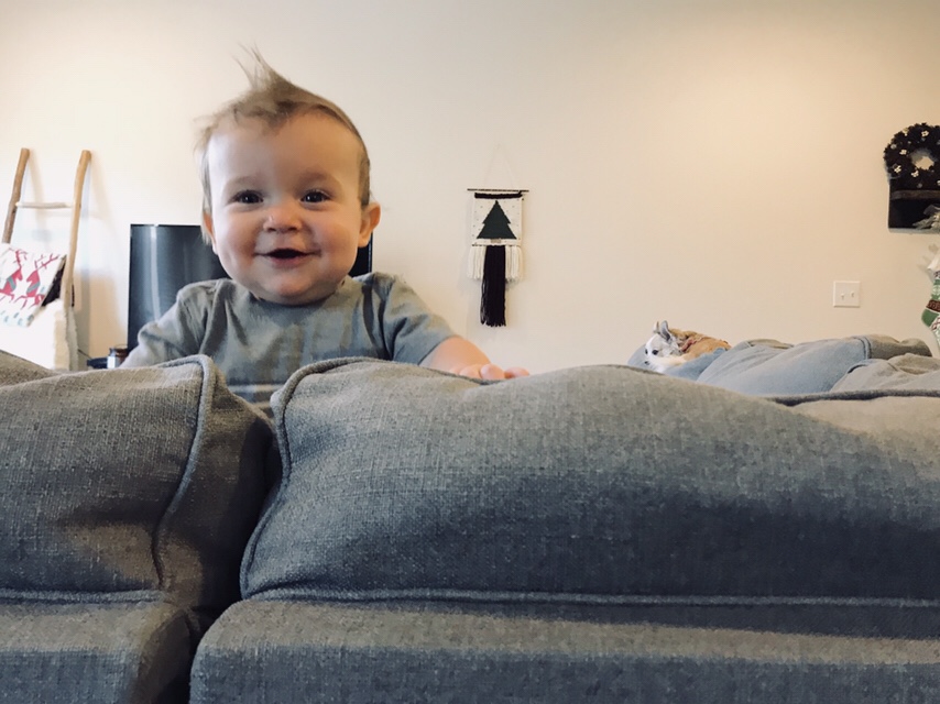 This last month Waylen has mastered crawling up the stairs, still pulls himself up on everything, and loves walking along the back of the couch. Seriously though he’ll spend 45 minutes entertaining himself on the couch. Ha he still isn’t walking or standing unassisted (for more then a couple seconds) but I really think it’s because his feet are SO fat. His toes literally curl down to the ground since his feet are so plump lol.