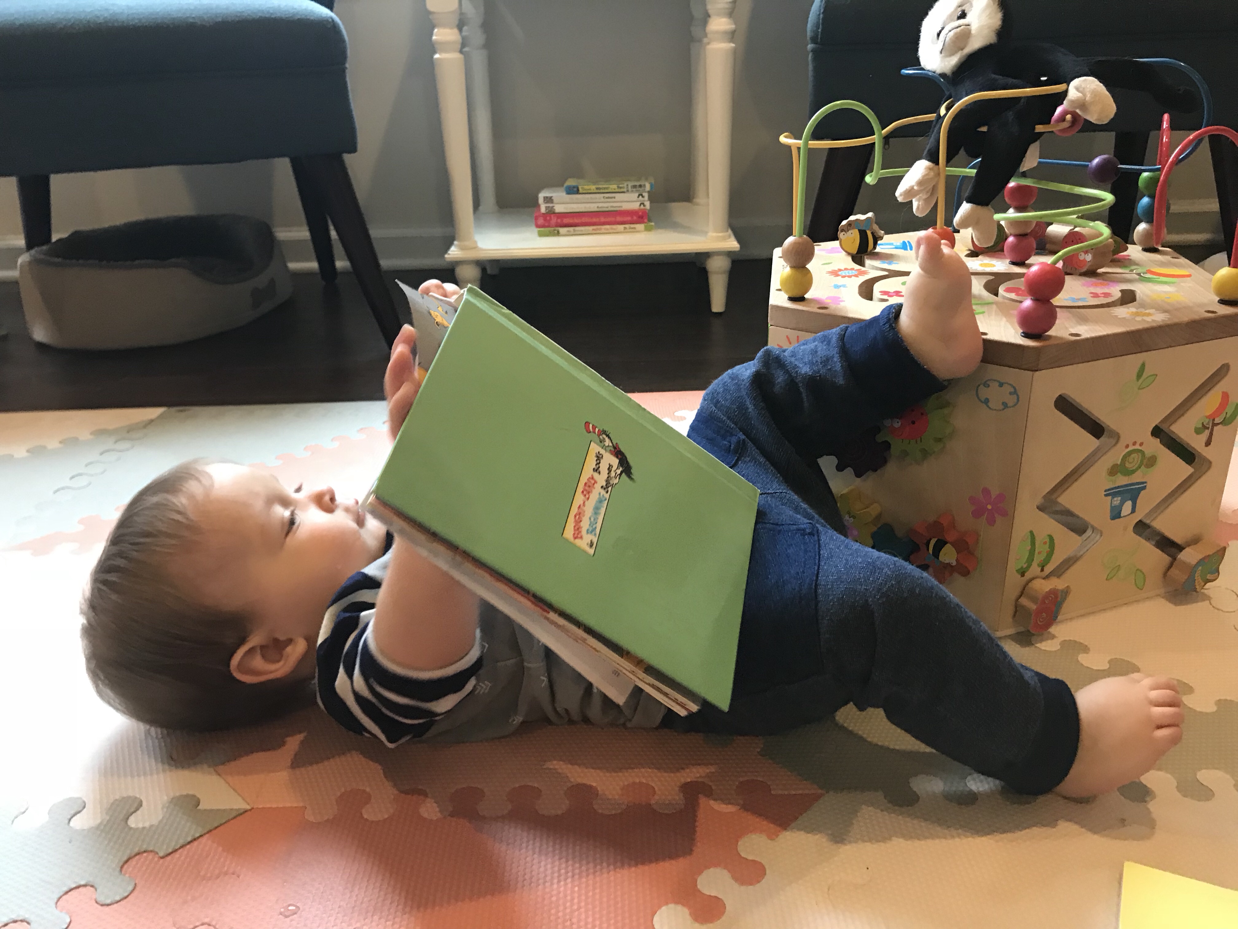 His favorite things this month are the couch, climbing the stairs, banging on my drum side table, crawling from any far away spot in the house to get to the dog bowls, watching the record player, and getting licked by the puppies. He has learned to give kisses (which is pretty much the cutest thing ever,) and loves flipping through all his books.