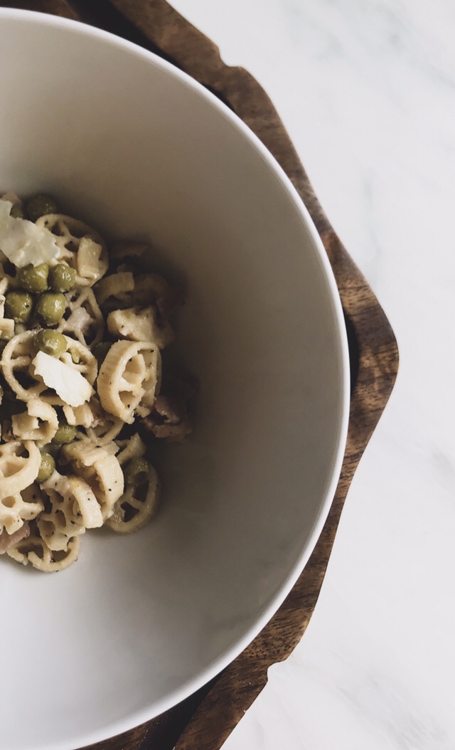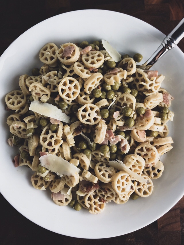 - Toss strained Pasta in Lemon juice and zest, mix in strained Peas and Pancetta, then shave Parmesan on top (we did about 1/4 cup)