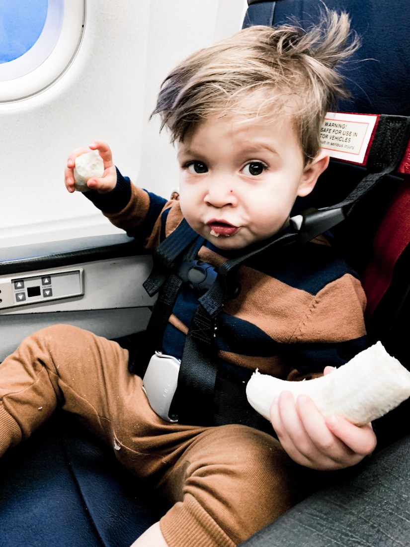 We took off right around breakfast time so we ate that on the plane then continued to snack the rest of the flight. Our schedule was pretty much eat, play with a few different toys, eat again, pull up some new stuff, eat again … ha a never ending cycle of new toys and new food.