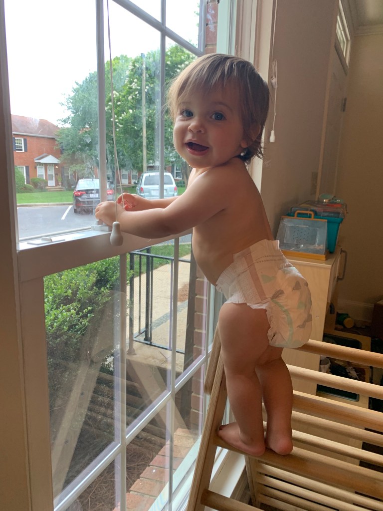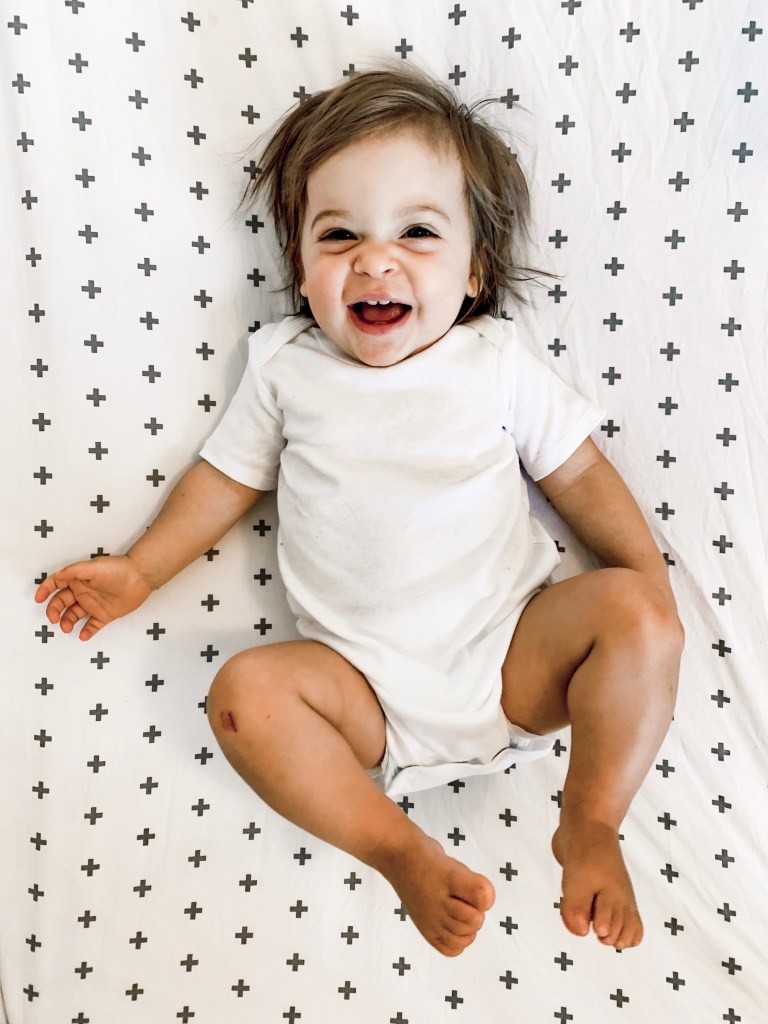 She has started to identify her body parts, she makes sound effects for her cars, and will moo when she sees a cow. Besides that though she’s not a big talker! She only really says dada and sometimessssss mama but she understands what we’re saying and will follow almost all of our commands. “Bring me the blue ball.” “Put your hat on.” “Find your foxy.” She also can identify objects in books and is obsessed with keys. Maybe the only other word she really attempts to say ha. But I’m not worried at all, I bet she’ll be just like her brother and go from a couple words to all of them in a week.