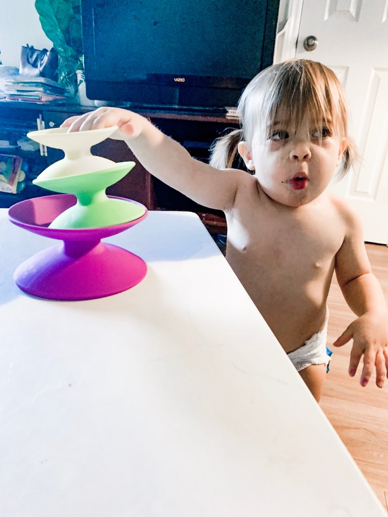 As for talking, she still doesn’t say much!Mama, dad, and keys (one of her favorite toys 😂) are still her main words. She will also do most animal noises like cat, dog, monkey, bee, horse, etc. She still knows everything we’re saying though and easily follows directions. She can also identify animals and objects in her books as well as all her body parts. Don’t mention snacks or dinner around her unless you want her sprinting to the kitchen in search of food.