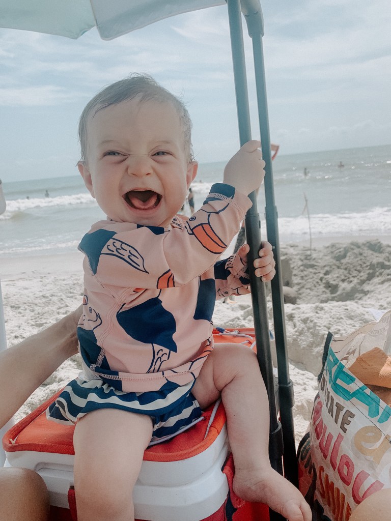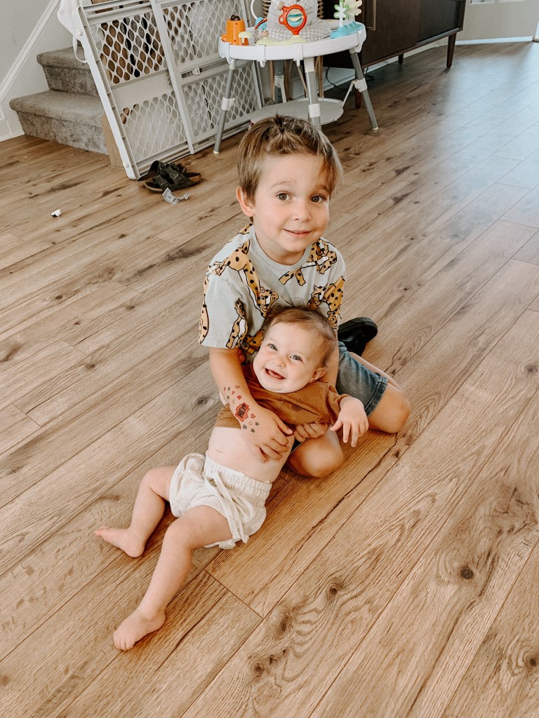 She’s still not officially crawling yet but she is a pro army crawler just like Waylen was and can fly across the floor. She’s starting to pull up and loves to practice standing.